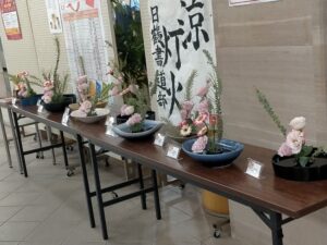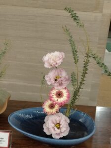 その中でも、今日は部内で人気が高かった三つの作品をご紹介します。すらり上に伸びる枝や可愛らしくまとまるお花の空気感が好きだなぁ、と私も思います。他の子の作品もどれも生き生きと活けられていますので、楽しんでいただけたらと思います。(エントランスの華展は来週火曜までの開催です。)