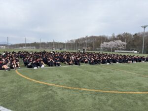グラウンドに集合し、クラス対抗の大縄跳びとドッジボール大会を行いました。