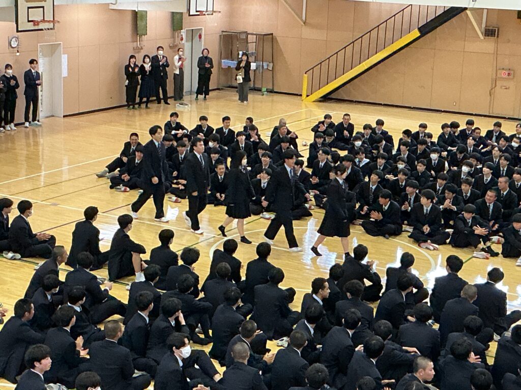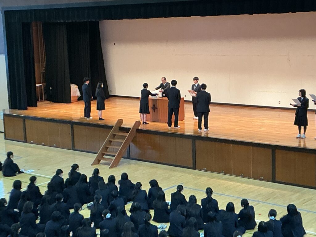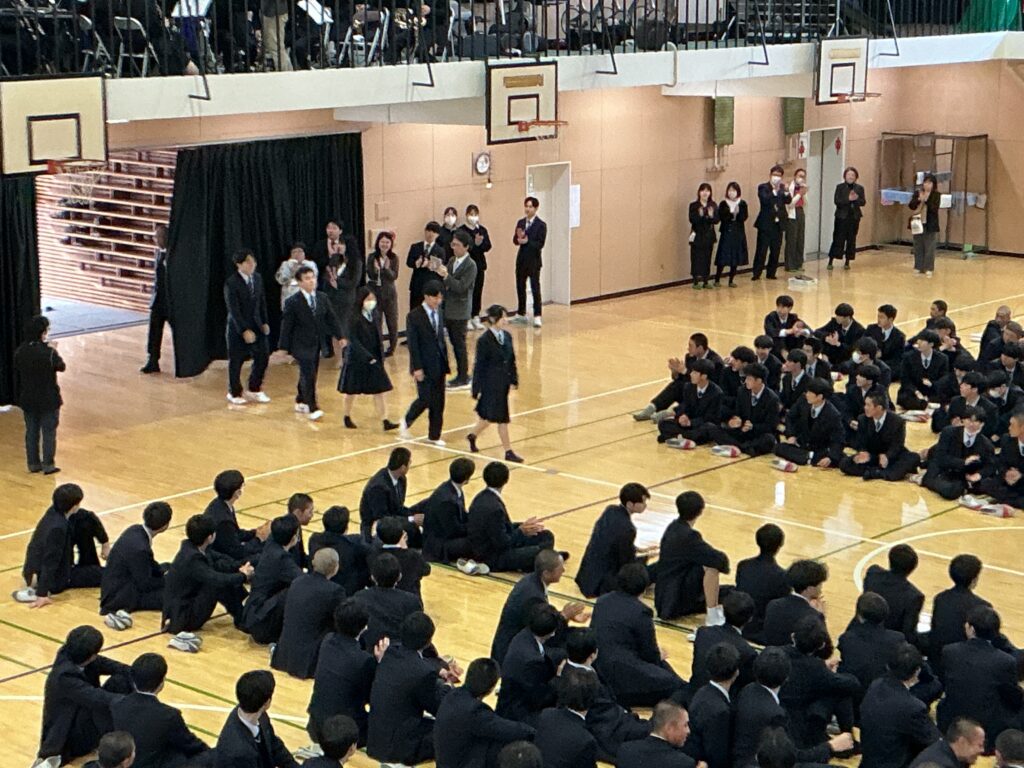 続いて離任式が行われ,本校を離れられる菊山新士先生が本校での思い出や人間の備えるべき「徳」について熱く語られました。その後生徒・教員に見送られて退場し,また教頭から今年度をもって離任される非常勤講師のお名前が読み上げられました。