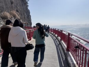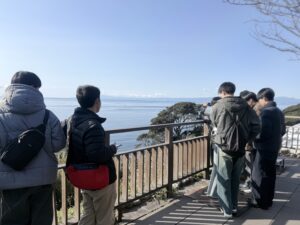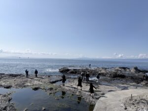 江の島はコンパクトな島ながら起伏に富んでいて,階段の上り下りを繰り返しての移動が続きました。だんだん暑くなり上着を脱ぐ生徒もいれば,眺めのいい場所に立ち寄り写真撮影をしたり,稚児が淵ではしゃいだり,突然たこせんべいを買って食べる生徒もいたり,プレゼンでオススメのおまんじゅうをみんなで食べたり,きまぐれ気ままなツアーです。