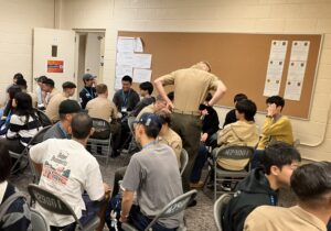 午前中は米軍基地内見学とコザの街歩きに分かれて行動しました。米軍基地では3~4人のグループごとに海兵隊員の方とお話をさせていただきました。趣味やスポーツ,アニメの話など90分ほどの時間でしたが話題が尽きることがありませんでした。また,基地内の沖縄戦に関する資料室も見学させていただき,日米両方の思いを学ばせていただきました。
