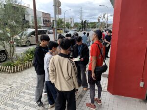 コザの街歩きでは8班に分かれ,それぞれガイドさんにコザの街をご案内いただきながら,コザの街の成り立ちや米軍基地との関わりを紹介していただきました。ふとした時に見上げる看板の何気ない表記から,コザの街が米軍基地といかに密接につながっているのかが分かります。一般道路に引かれている黄色のラインは米軍基地との境界線を示しているそうで,自分たちは日本に今いるはずなのに,そのラインを踏み越えると日本の法律が一切通用しない世界になるという不思議な感覚にとらわれました。生徒たちは米軍基地と共存する街の様子を目の当たりにし,貴重な経験を積めたと思います。