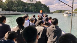 ステーキハウス88で昼食をとった後はクラスごとに平和学習クルーズでアメリカ軍が上陸した場所を海上から見学しました。その後,道の駅かでなに移動し,嘉手納基地を外から眺め,騒音問題の現状を学びました。
