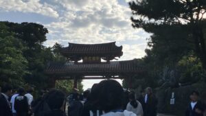 いよいよ最終日。ホテルから首里城までが最後のバス移動となります。お世話になった運転手さんに感謝の気持ちを伝え別れました。首里城はまだ工事中で本来の姿は見られませんでしたが,様々な門の役割などの説明を聞きながら,よい景色を楽しみました。ガイドさんともここでお別れをし,班ごとに国際通りを経由しながら那覇空港を目指しました。国際通りでは家族や友人,自分用にとたくさんのお土産を購入していました。すべての班が時間通りに那覇空港に集合することができ,少しフライト時間は遅れていましたが,18時半ごろ無事に全員で羽田で解散式を行うことができました。